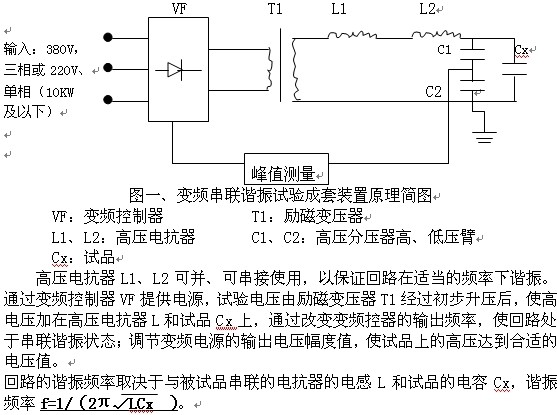變頻串聯(lián)諧振成套試驗(yàn)裝置是運(yùn)用串聯(lián)諧振的原理,利用勵(lì)磁變壓器激發(fā)串聯(lián)諧振回路,通過調(diào)節(jié)變頻控制器的輸出頻率,使得回路中的電抗器電感L和試品電容C發(fā)生串聯(lián)諧振,諧振電壓即為試品上所加電壓。變頻諧振試驗(yàn)裝置廣泛用于電力、冶金、石油、化工等行業(yè),適用于大容量、高電壓的電容性試品的交接和預(yù)防性試驗(yàn)。